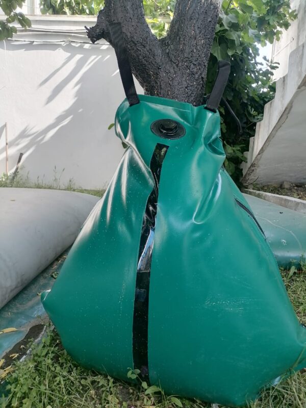 Der Sack lässt sich in wenigen Minuten mit einem Gartenschlauch befüllen und erreicht ein Gewicht von 75 kg.